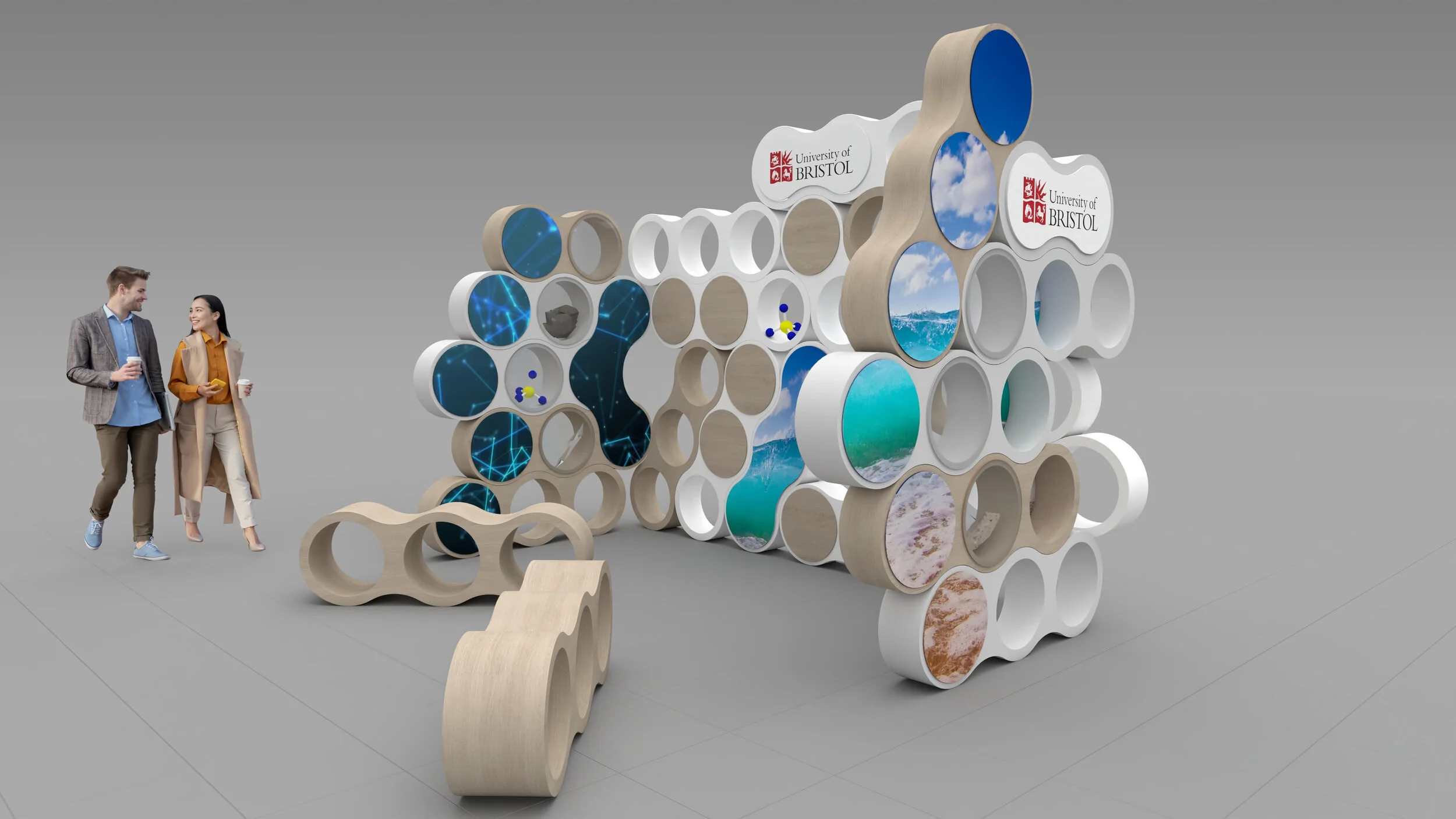 The custom modular exhibition stand structure was designed to be reconfigured to meet any given display need, as well as to facilitate construction, without the need for complex tools or methods.
